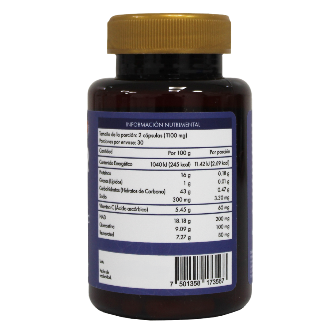Suplemento alimenticio con NAD⁺, resveratrol, vitamina C y quercetina. Diseñado para quienes buscan mantener su bienestar integral y sentirse con energía día a día. Su fórmula combina antioxidantes y compuestos naturales que apoyan tu estilo de vida saludable desde el interior.